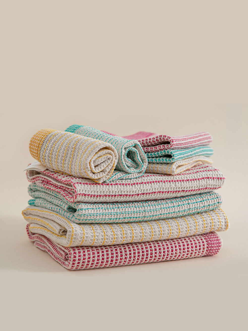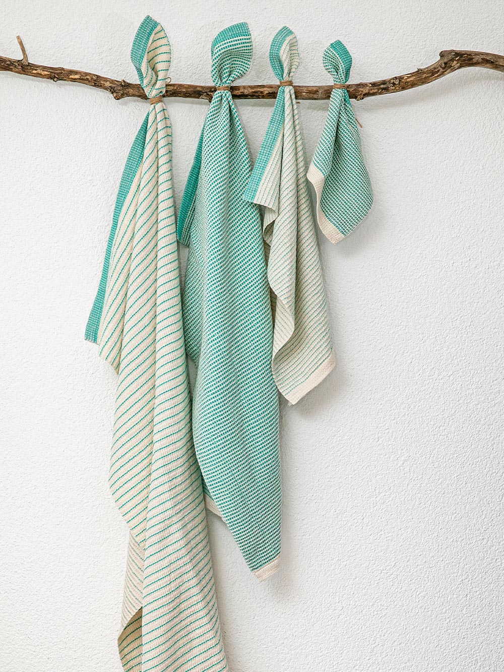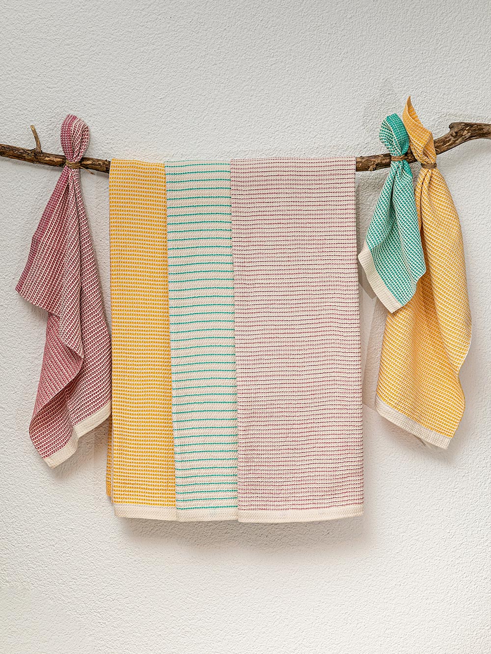 La linea include quattro formati: telo da doccia, asciugamano, asciugamano ospiti e lavetta. Pensata per essere versatile, offre infinite combinazioni di colori e design perfettamente coordinati.