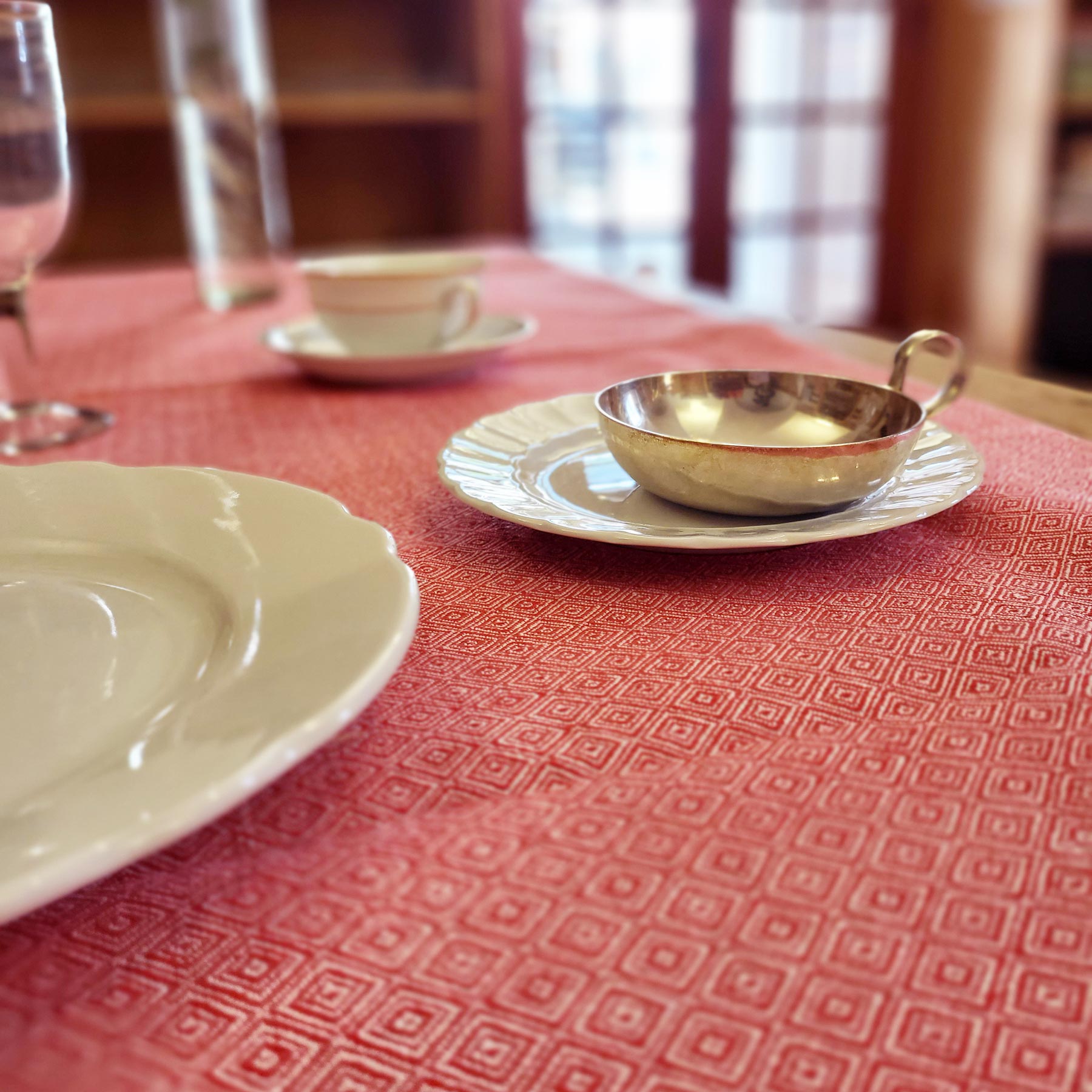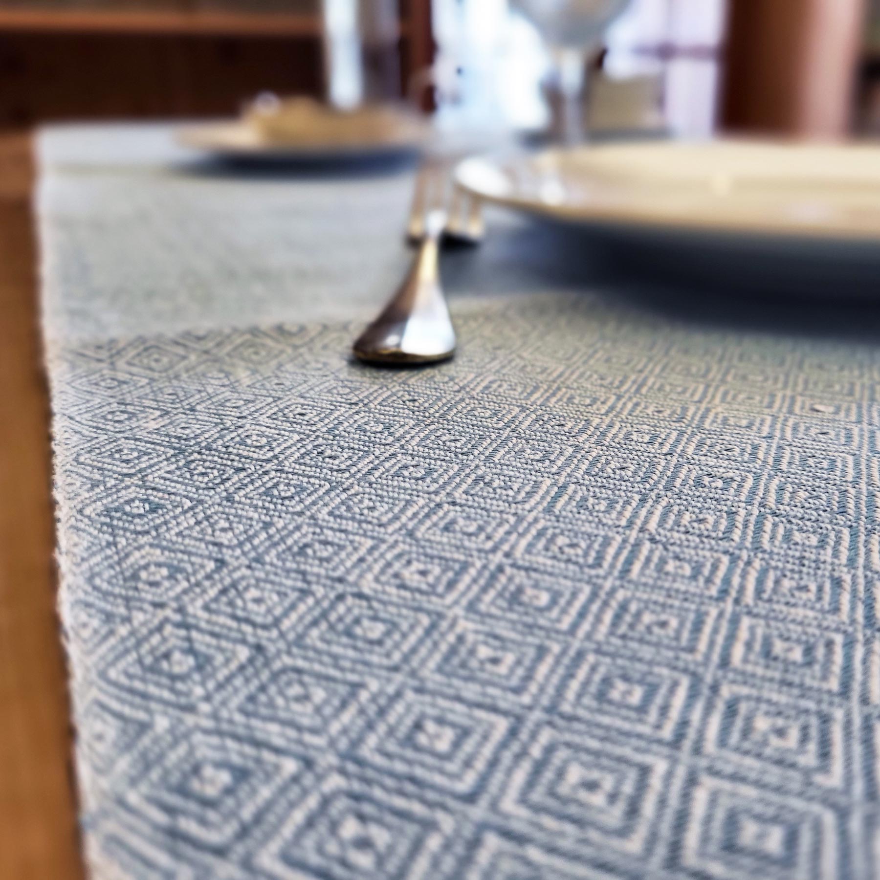 Raffinata Striscia da tavola in puro lino con motivo a Occhio di Pernice.